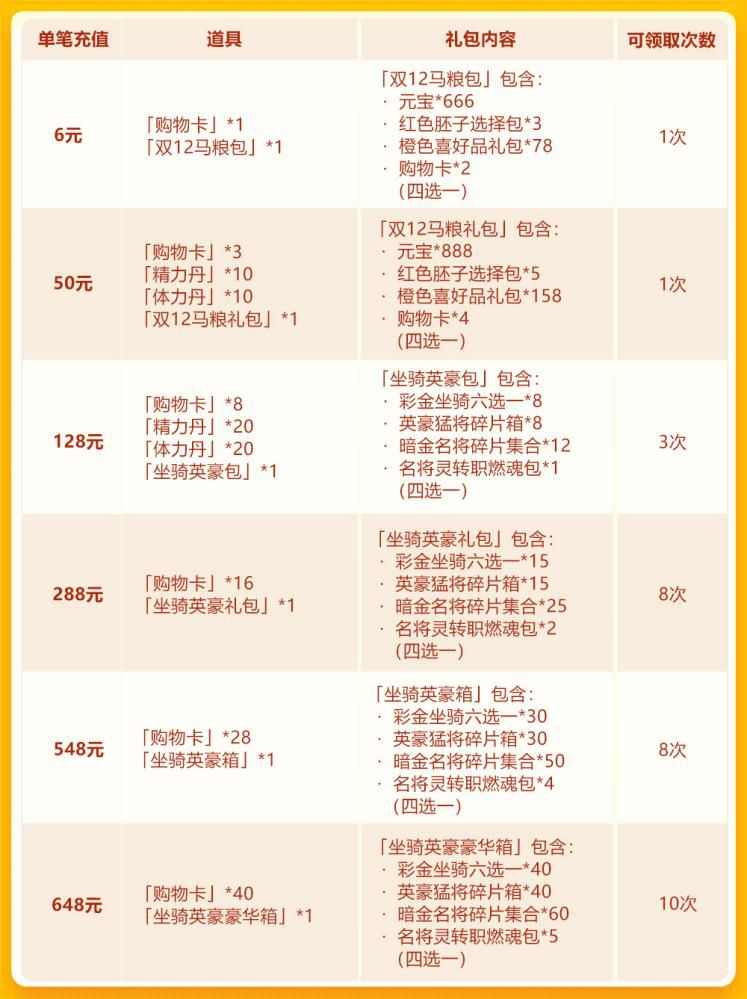 亲爱的少年们: 双十二欢庆上线,全新彩 金坐骑祥瑞钧天泽、赤胆朱魄鸾明日并驾首发,作为象征祥瑞的神兽,它们特性出众,能力不凡! 此外,少三之路活动再度开启,海量福利伴少年一同度过2019年的最后一个月,还有超值双十二活动上线,元宝贩售中彩 金坐骑六选一、英豪猛将碎片箱两种彩金道具半价优惠出售,不容错过哦~ 活动时间: 2019年12月12日00:00~2019年12月15日00:00 活动范围: 服