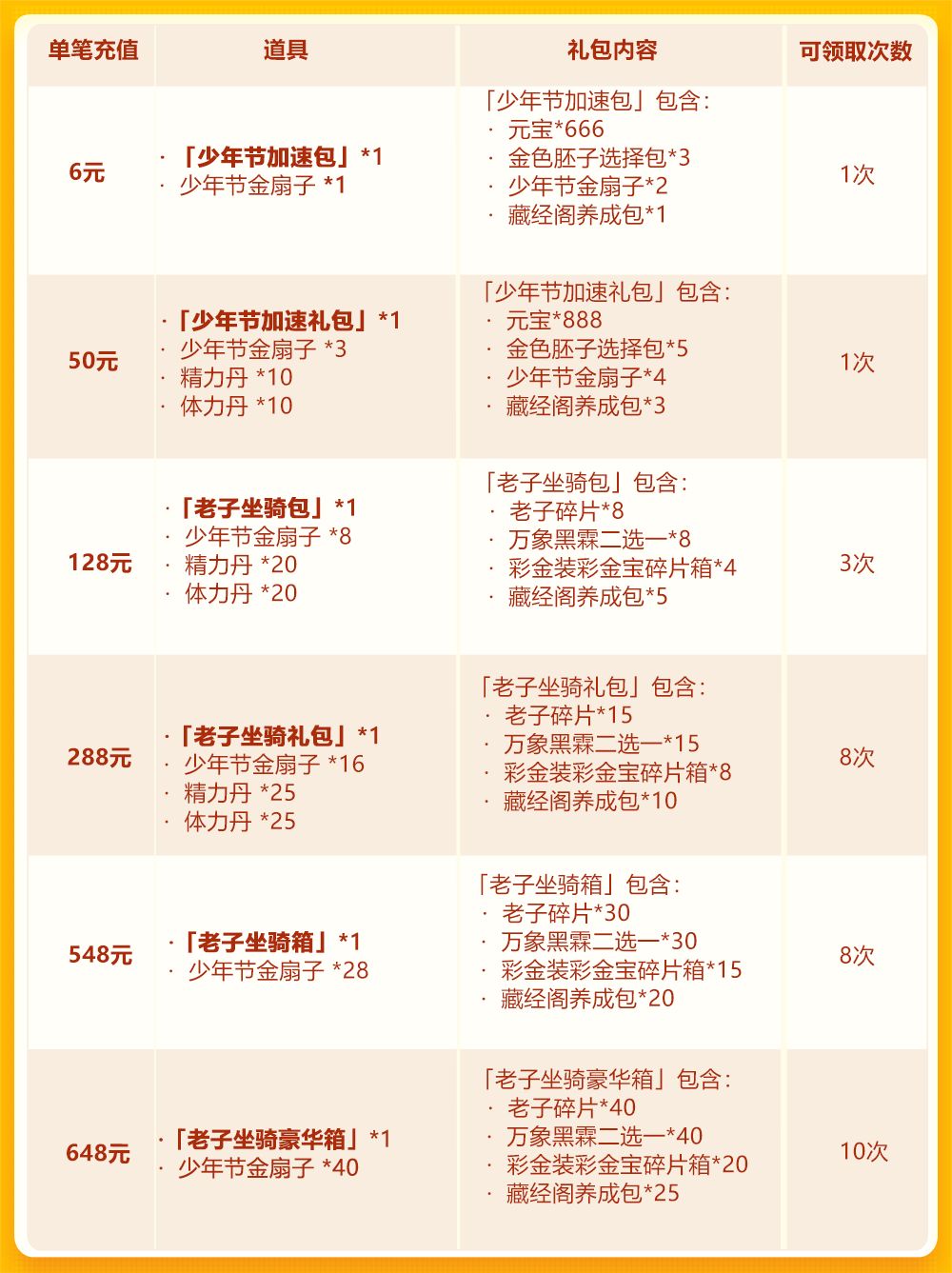 亲爱的少年们: 来了来了!少年节欢庆第五轮,琉金名将——老子首度返场,携手琉金坐骑双双来袭!老子碎片、万象黑霖二选一等资源限时获取;彩 金宝物任选包、彩 金装碎片任选箱等珍稀好礼就在每日单充;同期超值单充还有彩 金宝物任选包、彩 金装碎片任选箱任你挑选!另外,少年节福利活动仍在火热进行中,惊喜不断,火速赶来! 活动时间: 2020年6月25日0:00~2020年6月28日0:00 活动范围: 服务