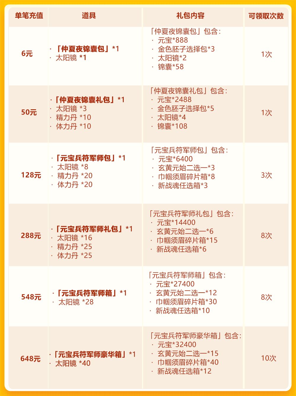 亲爱的少年们: 仲夏夜欢庆第三轮,琉金兵符限时获取!少年们单笔充值,即可获得元宝、玄黄元始二选一、巾帼须眉碎片箱等资源;欢庆折扣商店低至2折,大量珍稀道具任你挑选!巾帼须眉碎片箱、暗金马碎片集合包就在每日单充;更有限时礼包,内含暗金时装、新战魂任选箱等珍稀好礼!小乔期待少年们的参与哦~ 活动时间: 2020年5月29日0:00~2020年6月1日0:00 活动范围: 服务器开启满7天的服均可参加 —