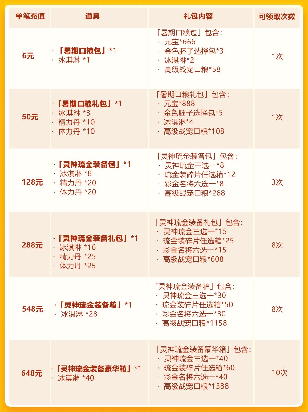 亲爱的少年们: 夏日炎炎送清凉~暑期欢庆第二轮活动中,琉金战宠——灵神·女娇携同琉金装备限时返场!少年们单笔充值至指定金额,即可获得灵神琉金三选一、琉金装碎片任选箱等珍稀资源;更有特别时空礼包登场,鼠来宝碎片、兵神玄女碎片、琉金装碎片任选箱等琉金豪礼不容错失! 活动时间: 2020年7月4日0:00~2020年7月7日0:00 活动范围: 服务器开启满7天的服均可参加 ——暑期欢庆·琉金战宠—— 活