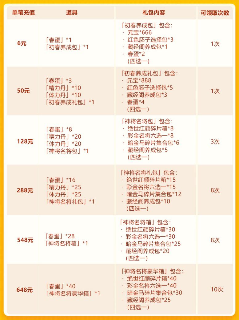 亲爱的少年们: 春节欢庆第四轮活动来袭! 在本期活动中,耀世猛将会再次与大家见面;暗金神兵降世,助力少年随心闯荡三国!此外,还有名将灵等道具限时获取,千万不要错过哦~ 活动时间: 2019年2月11日00:00~2019年2月14日00:00 活动范围: 服务器开启满7天的服均可参加(开服≥8天) ——春节欢庆·耀世猛将—— 活动一、耀世猛将限时获取 活动时间:2月11日00:00~2月14日0