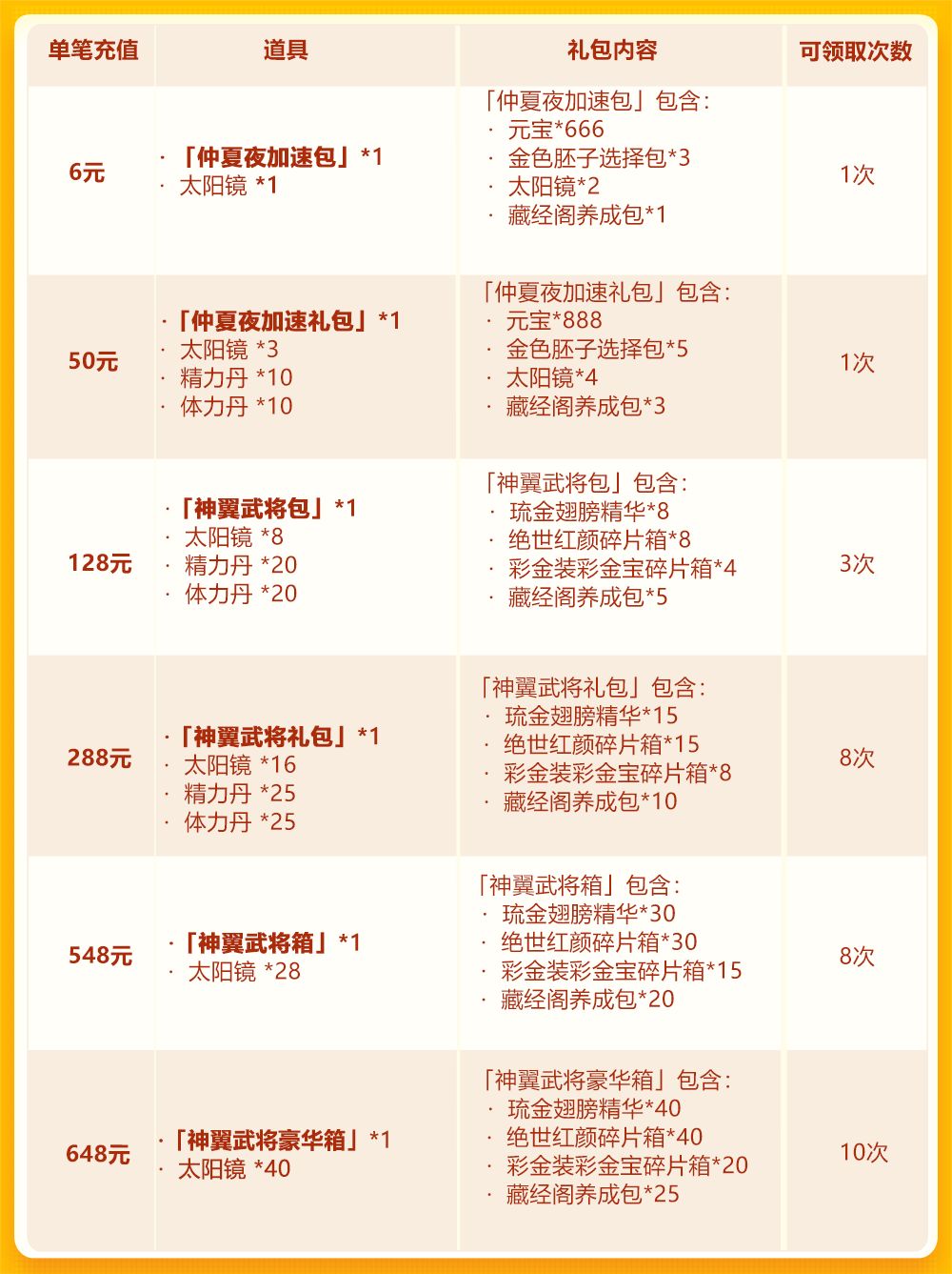亲爱的少年们: 每月一次的欢乐抽奖再度开启!丰厚道具唾手可得~欢乐金币即可兑换轮回不灭碎片箱、彩 金翅膀精华、旷世君王碎片箱,使用欢乐银币还可获得彩 金翅膀合成卡、彩 金神兵碎片箱!每日单充更有彩 金神翼助你遨游三国;除此以外,时空礼包驾到,琉金豪礼等你来拿!机不可失,少年,就差你一个啦~ 活动时间: 2020年6月10日00:00~2020年6月13日00:00 活动范围: 服务器开启满7天的服