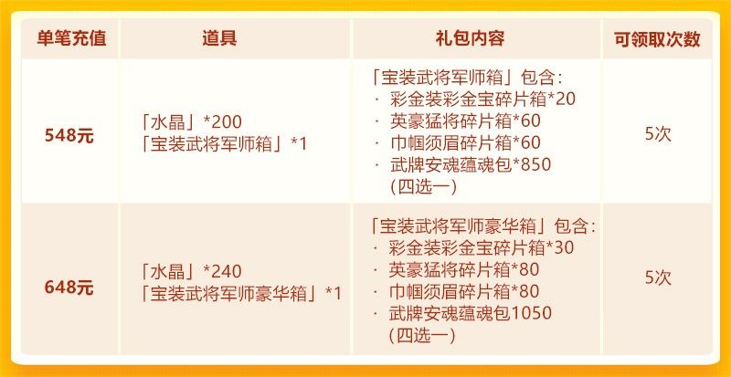 亲爱的少年们: 水晶翻倍再度来袭,五周年庆典就在眼前!在本次的活动中,彩 金军师、英豪猛将集结助阵,更有彩 金宝物、彩 金装备限时获取,一起来看看吧~ 活动时间: 2020年1月13日00:00~2020年1月15日00:00 活动范围: 服务器开启满7天的服均可参加(开服≥8天) ——水晶翻倍—— 活动一、水晶限时翻倍获取 在水晶翻倍期间,少年们部分档位充值获得的水晶和“豪华签到”中获得的水晶可