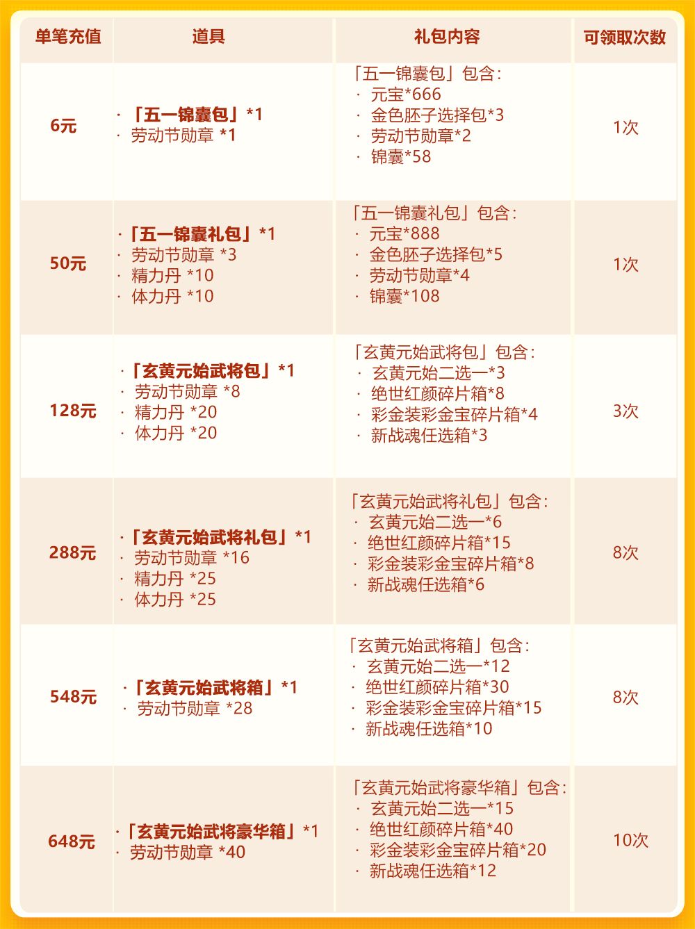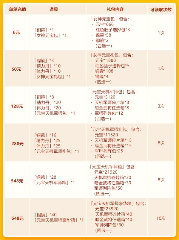 亲爱的少年们: 五一假期最后一天,小乔依然不会令大家失望哒~噔噔噔!琉金兵符携手琉金武将,双琉金品质齐齐闪耀登场~活动期间,少年们充值即可获得玄黄元始二选一、绝世红颜碎片箱;每日单充还有彩 金宝物任选包、彩 金装碎片任选箱等道具等你来拿!更多养成资源就在5月签到商店~少年拿出战力来,强化升星趁现在! 活动时间: 2020年5月5日00:00~2020年5月8日00:00 活动范围: 服务器开启满7