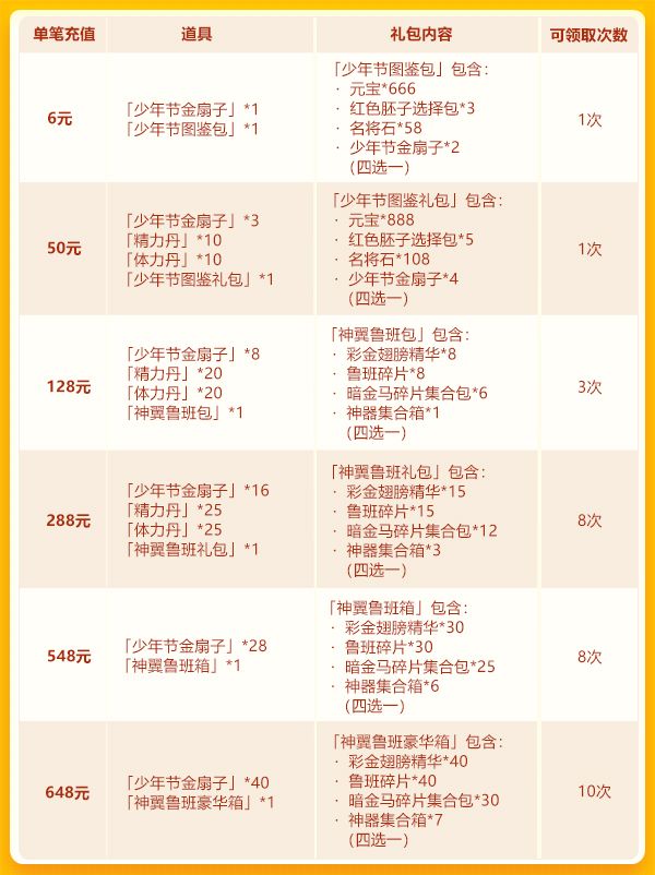 亲爱的少年们: 少年节欢庆第三期来袭~在本期活动中,可限时获取彩 金神翼,还有彩 金名将鲁班同步助阵! 更有超值周基金活动上线,丰富资源,不容错过! 活动时间: 2019年6月20日00:00~2019年6月23日00:00 活动范围: 服务器开启满7天的服均可参加(开服≥8天) ——少年节欢庆·彩 金名将—— 活动一、彩 金名将限时获取 活动时间:6月20日00:00~6月23日00:00 在