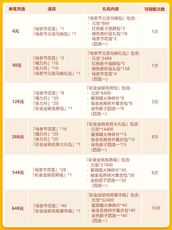 【活动公告】母亲节欢庆第三轮:500%充返+彩 金坐骑+暗金名将