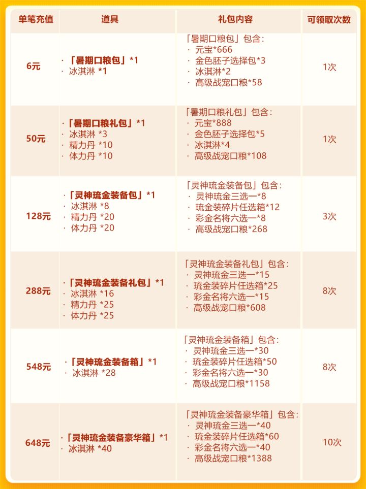 亲爱的少年们:夏日炎炎送清凉~暑期欢庆第二轮活动中,琉金战宠——灵神·女娇携同琉金装备限时返场!少年们单笔充值至指定金额,即可获得灵神琉金三选一、琉金装碎片任选箱等珍稀资源;更有特别时空礼包登场,鼠来宝碎片、兵神玄女碎片、琉金装碎片任选箱等琉金豪礼不容错失!活动时间:2020年7月4日0:00~2020年7月7日0:00活动范围:服务器开启满7天的服均可参加——暑期欢庆·琉金战宠——活