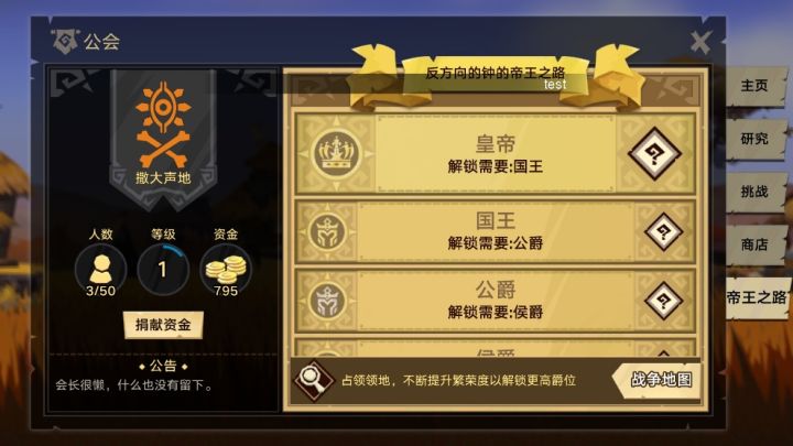 大家好,帅气迷人的小编又和大家见面啦~今天要给大家介绍的可是一个可以获得至高荣誉的模式,不仅可以自己获得王侯将相的资格,而且能够授予官职,可谓是光宗耀祖的最佳途径啦!究竟是什么模式有如此大的作用呢?没错,就是公会模式中的“帝王之路”——战争模式。公会与公会之间的强强对决,团队与团队的争锋,一起来了解一下吧!【帝王之路】在帝王之路中,有着非常严格的等级划分:领主、男爵、子爵、伯爵、侯爵、公爵、国