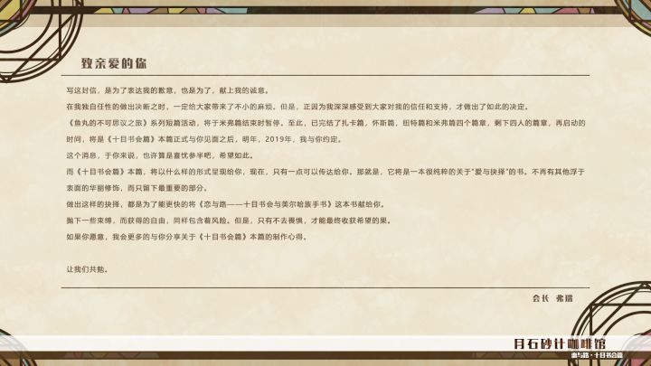 致亲爱的你,距离试读版本发布还有一天。相信我,我一定比你更焦躁不安。先用片头来安抚一下吧。明天在开始试读版本之前,请一定先阅读一系列的注意事项。因为我在技术能力上的欠缺,而给你带来的不便,抑或是不好的体验。再次再次鞠躬致歉。会长 弗瑞——————————————————————————————————月石砂计咖啡馆店铺地址:曼缇纳城市中心市场179号官方微博: