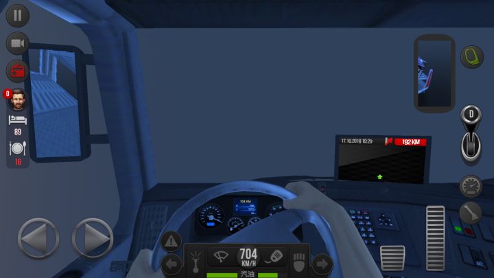 切换到第一人称,打开后视镜,选一个喜欢的电台,启动引擎……你会瞬间迷上开卡车的感觉!游戏模拟的环境极为逼真,晚上可以打开大灯,下雨时开雨刷,转弯能打转向等,后视镜里擦身而过的汽车、围栏让人时刻提心吊胆,即使是直行,也一点都不敢马虎。玩家要完成游戏布置的装货、运货、卸货等任务来获得报酬,装货和卸货相对困难,因为要反覆地前进、后退,来让车尾和货物区对接,这个阶段切换第三人称视角,能大幅降低难度。不