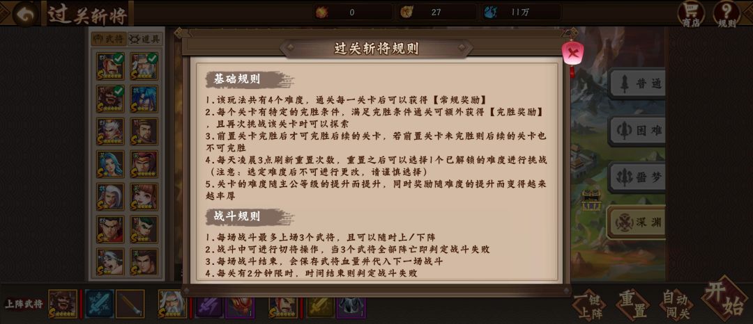 1.过关斩将 过关斩将副本难度分为:普通、困难、噩梦、深渊,需要通过前一个难度的副本才能挑战下一个难度的副本,每天可以重置1次,重置后可以选择已解锁的难度进行挑战,但同时要注意条件要求。 奖励规则:每个难度下的每个关卡通关后都能获得相应奖励的宝箱,如果关卡挑战完胜后还会获得额外完胜宝箱,在任意已通过难度的副本中可以进行扫荡,扫荡可以每天重置后进行。 特别注意的是挑战关卡副本中如果发现过不去,可以