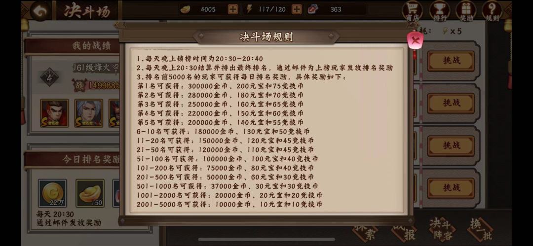 对大多数玩家而言,都不是各种猛充的钞能力玩家。所以,我建议在充的方面量力而行、适度即可,但平时要尽可能利用好资源,这样才能让游戏内的角色成长更快,进度跟得上主流节奏,也让实力保持在一个相对较好的水平。我就分享一些资源利用的技巧。 继续说元宝获取和囤积。决斗场是一个每天必打(或扫荡)的获取元宝的途径。决斗场即使是手动挑战,5局需要花费的时间也很少,如果是扫荡更是秒扫。我建议战力争取保持在全区前50名