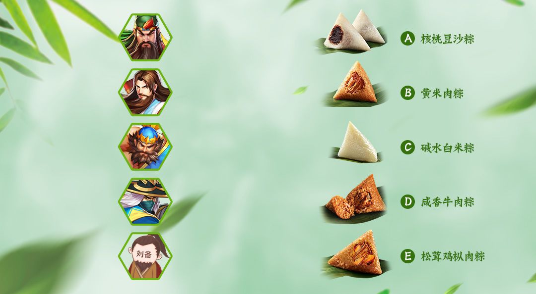 端午将至 ,三国酒肆推出了各种口味的粽子,各地寻粽香而来的客人络绎不绝。是日,酒肆中迎来了一批“大人物”。店小二能否根据各位“老饕”的喜好提供令人满意的粽子呢?各位机智的主公不妨来帮帮他吧! 【活动规则】 根据客人喜好的口味,提供对应的粽子 关羽:平素喜欢大口吃肉,十分想念老家山西的味道。 诸葛亮:怀念在隆中当“村夫”的日子,想尝尝带有山村独有的菌菇风味的粽子 张飞:不喜食甜,酷爱吃牛肉 庞统:坊