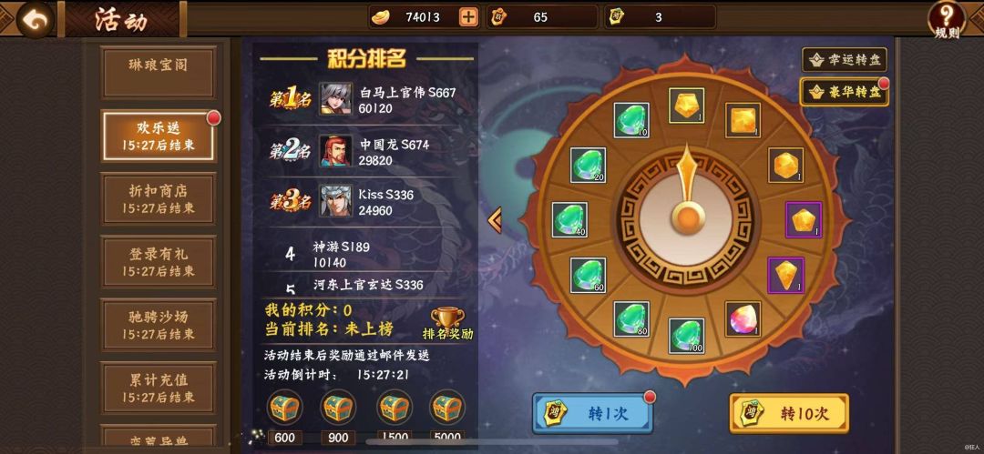 欢乐送玩法作为三国2的宝石材料获取途径,千万不要被表面文字所迷惑,认为是huandong送大礼活动。其实简单点就是转盘抽奖玩法,属于快速提升装备宝石面板途径。 欢动送分为幸运转盘和豪华转盘,幸运转盘需要欢乐券才能参与,豪华转盘需要鸿运券,欢乐券可以通过折扣商店元宝购买获取或累计登录获取;鸿运券就只能通过幸运转盘获得。 活动奖励:幸运转盘奖励为宝石精华、宝石碎片、金币、鸿运券、欢乐券;豪华转盘奖