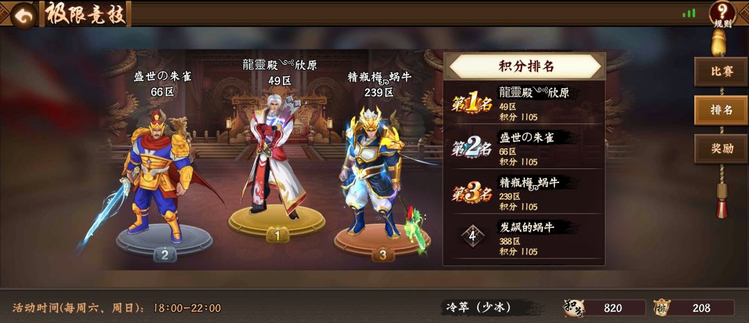 #攻略分享#三国2之极限竞技篇 极限竞技作为三国2特有玩法,由于阵法、神剑均不带入,并且开放全阵营武将,初始3冠天赋属性,算是平民玩家最有希望站上领奖台的竞技比赛。 比赛时间:每个月为一轮,每周周六、周日开放,晚上6点到10点。 比赛奖励:主要关注前50名,前50名分别获得数量不等的高级招募卡、宝石精华、神仙笔碎片,这也是白嫖宝石精华、神仙笔碎片,快速提升宝石及神仙笔的途径之一。 比赛规则:每轮