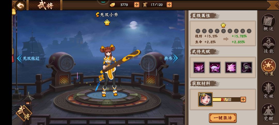 试炼之地副本是《三国战记2》手游内很重要的PVE组成部分,玩家可以跨服匹配组队挑战每天的试炼副本,也可以创建房间邀请好友协同作战。通关副本不仅需要战力属性的匹配,同时也需要一定的技术熟练度才行。无双小乔作为主打副本辅助的一名武将,未来在试炼之地副本内的作用是非常大的,由于该武将小技能的持续时间(激活天赋后)均可以达到10秒,因此不管是单刷还是组队,这个持续性的buff都能够提升其他武将的技能输出伤