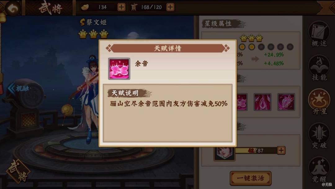 蔡文姬作为一名为封魔之战而生的女S武将,在团本内的重要性不可小觑,如若没有治疗的抬血,你终究会倒在吕布的身前。实际上在团本中,治疗武将的操作不仅仅是简单走下位、按个技能加加血那么简单,这需要建立在自己角色强弱的基础之上,今天和大家一起探讨一下蔡文姬的武将配置。 一、武将星级要求 作为治疗职业,在其他属性相同的情况之下,更高的星级会赋予天赋上的加成,天赋一静心和天赋二余音均是能够更好的帮助团本的小队