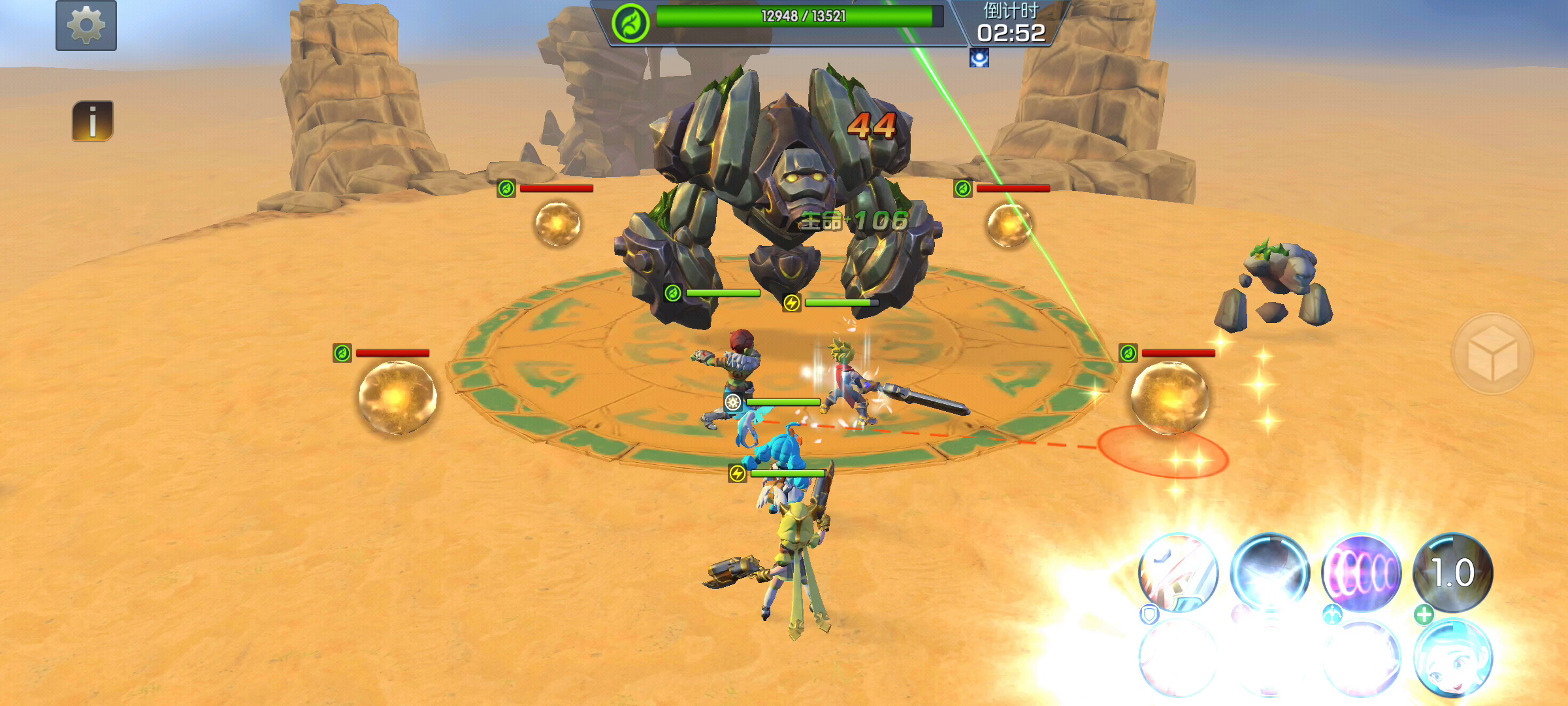 3个小技能用2个触发地刺,留1个打断BOSS技能。小治疗亮了就点。BOSS锤地的时候放前三个英雄的大招,注意治疗的大招需要持续施法。具体操作可以看看视频噢