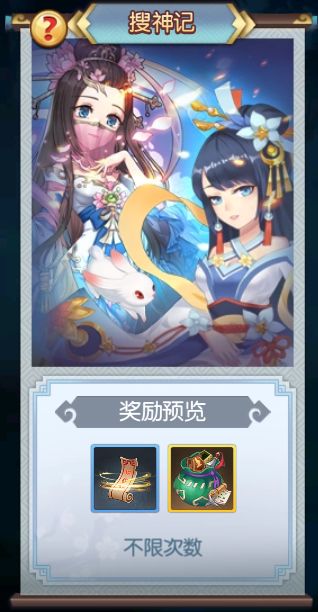 搜神记为单人或多人PVE玩法,主要产出灵宝符、随机法宝。玩家消耗6点耐力(单人挑战)或4点耐力(组队挑战,最多3人)挑战副本,通关后可获得灵宝符、随机法宝奖励。副本分章节,越高章节奖励灵宝符越多。玩家需单人通过前面章节的副本才能开启后面的章节。副本每日每人参与次数不限,每次消耗耐力。游戏中法宝是影响玩家实力的重要装备,而搜神记是游戏中大量高级法宝的产出途径,产出的灵宝符可在宝物商店兑换稀有法宝