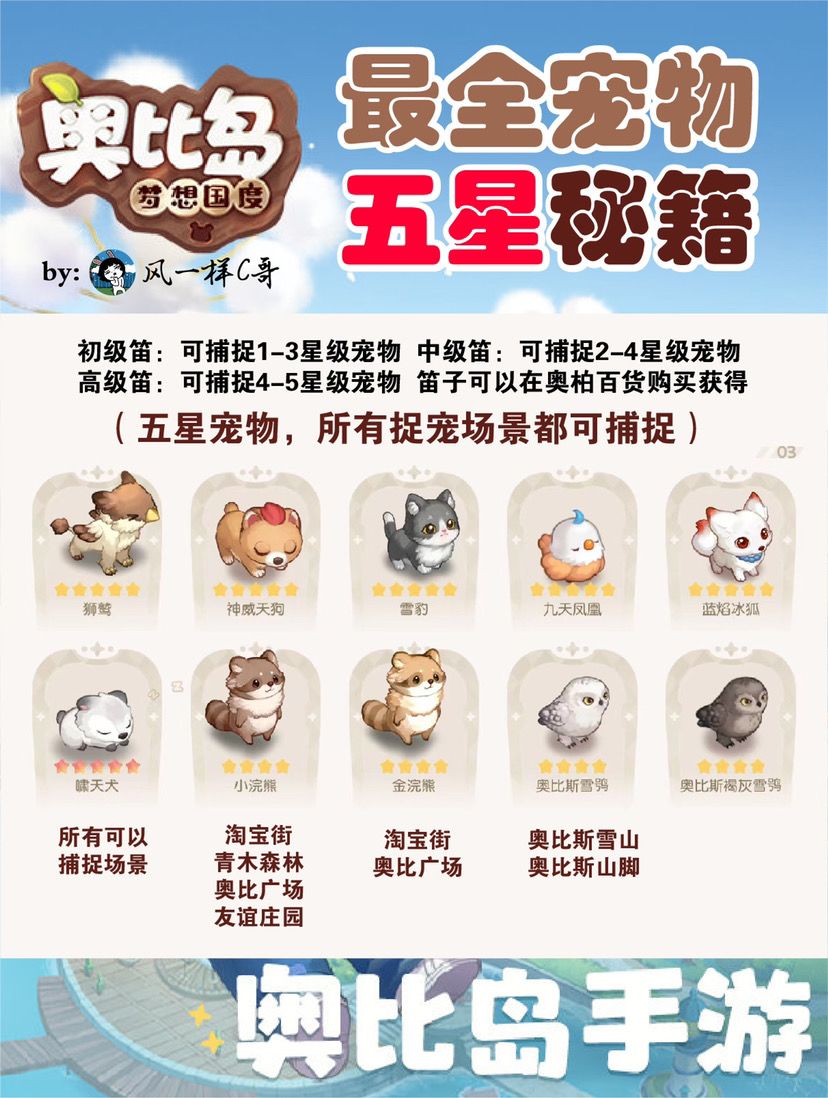 奥比岛手游最全的五星四星等宠物获取地点秘籍 奥比岛梦想国度手游,最全的宠物手游获取地点秘籍来了,一张图看懂,图鉴顺序方便查漏补缺, 你的小岛建设等级16级,解锁清凉临海海滩,完成宠物的家任务即可开始抓取宠物, 利用宠物笛来吸引并捕捉宠物!! (1)初级笛:可捕捉1-3星级宠物。 (2)中级笛:可捕捉2-4星级宠物!! (3)高级笛:可捕捉4-5星级宠物!! 宠物笛可以在奥柏百货购买,初级笛需要20