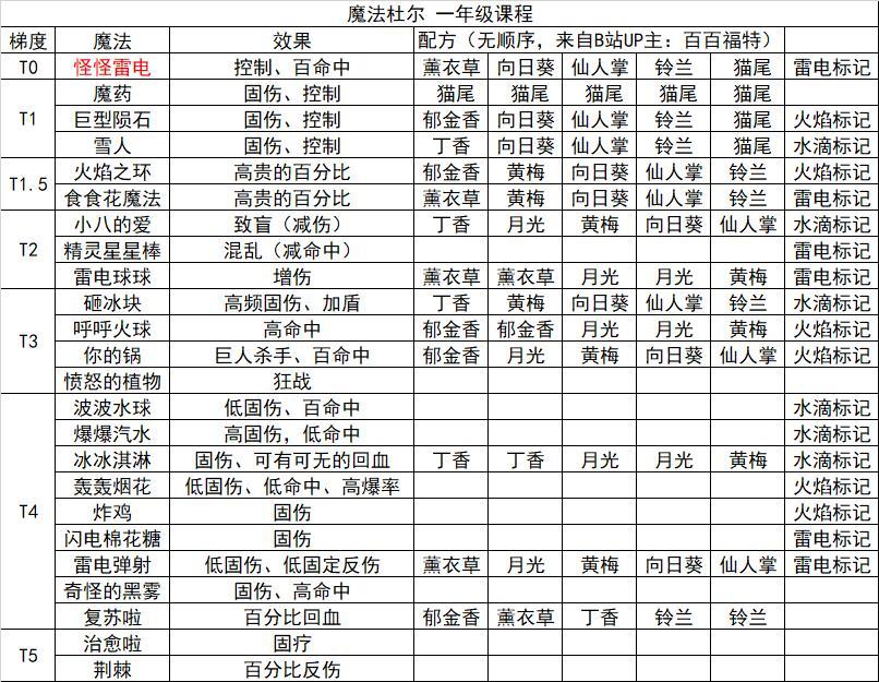魔法杜尔想必折磨大家很久了,我总结了一下网上散落的信息,给各个技能拍了个梯队。由于有的技能没学,很多技能等级低,所以我并不知道高等级的具体情况,这里姑且作为低等级的建议。希望大家能友好的广泛交流意见,尤其是技能等级高的小伙伴们。 空着的这几个是随机的,不用给我说配方了,你们说的那几个配方只是试的次数太少了。 水滴、火焰、雷电,叠三层触发不同的攻击技能。 开局buff没写,反正随机的,我们也左右不了