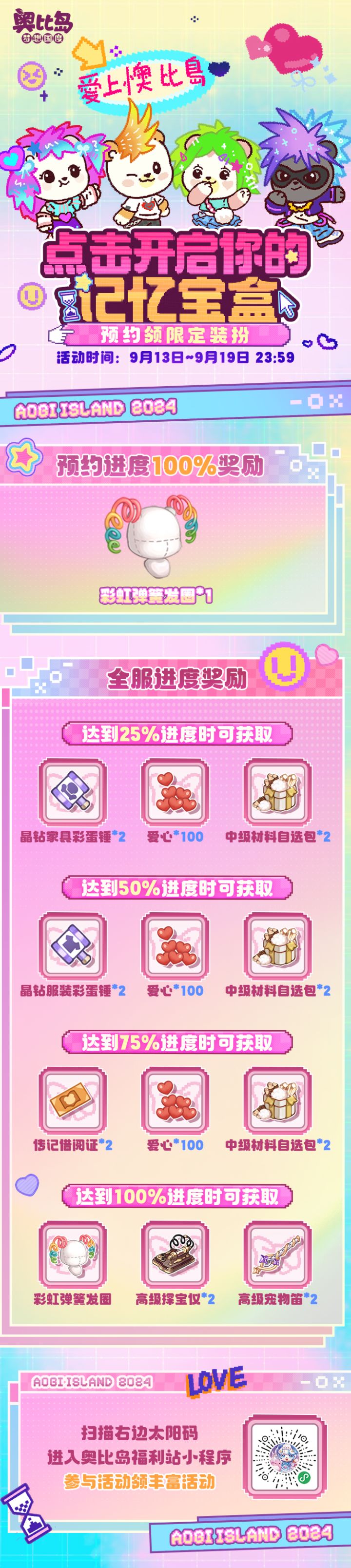 🎈3.3版本「奇妙游乐园」小程序预约活动火热开启啦,限定装扮彩虹弹簧发圈、星纳棉花娃娃等周边和道具畅享送不停!快前往「奥比岛福利站」小程序参与活动,让时光回溯,解锁你的快乐记忆~ ⭐活动时间⭐2024年9月13日-9月19日23:59 ⭐预约小程序新版本!免费领新装扮!⭐全体小奥比预约进度达到100%即可在9月20日免费获得「彩虹弹簧发圈」、「传记借阅证」、「高级探宝仪」、「高级宠物笛」超
