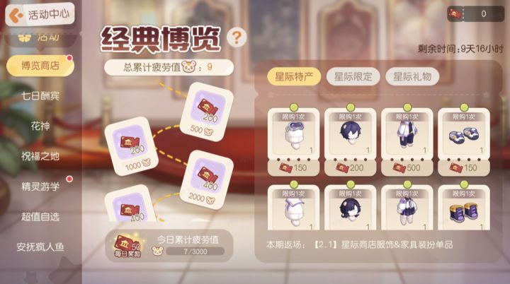 ⭐️新活动:「博览商店」第七期活动时间:8月16日5:00-8月28日23:59奥比们期待的兑换商店返场来啦!活动期间,小奥比们通过劳作、采伐、挖矿、钓鱼等行为累积疲劳值并获得获得「博览门票」,使用「博览门票」即可在「博览商店」中兑换往期主题商店的服饰、家具等物品,本次开启「 星际引导员套装」「星际播报员套装」「来自星星的卫衣」「两根天线发饰」「闪耀星球挎包」时装以及「机械音乐播放台」「机械悬