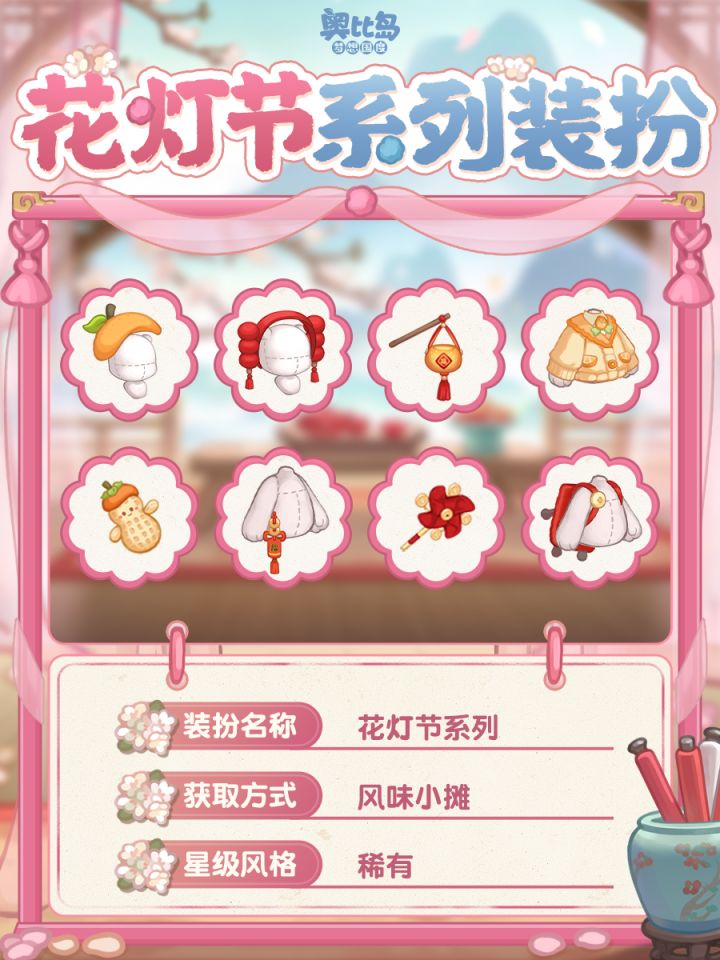 🎁小奥比们在漫游灯会时,别忘了前往「风味小摊」兑换免费礼物~ 小奥比们参与「花灯节」限时活动,可获得道具「桃花花灯」。「桃花花灯」可在「风味小摊」免费兑换「蜜橘针织衫」「砂糖桔桔皮帽」「好柿花生玩偶」「糖葫芦发箍」等装扮,以及「饺子热腾腾温泉」「饺子蒸笼桑拿」「汤圆小马车」「汤圆毛巾架」等家具,小奥比们不要错过哦~ ⭐活动时间⭐2月27日5:00-3月12日23:59 ⭐活动说明⭐1、在