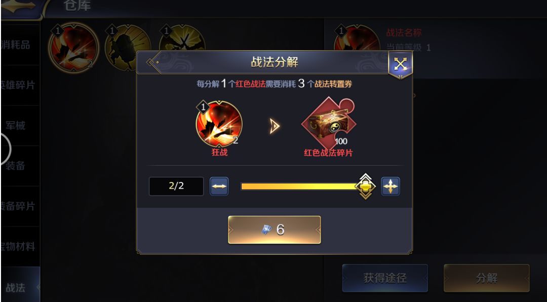 各位主公好,我是周瑜!一直以来,闲置的战法总是令主公们头痛不已,占据仓库席位却又没有明确的用武之地,当真是“食之无味,弃之可惜”。 在收到了大家的诸多反馈后,这一问题将在全新版本中一次解决,新功能战法分解即将上线啦,赶快一起来看看它将如何让多余的战法变“废”为宝吧! 新版本更新之后 主公们仓库内的金色、红色战法的信息界面 将增加“分解”功能 分解战法将需要消耗一定数量的“战法转置券” 下面我们以