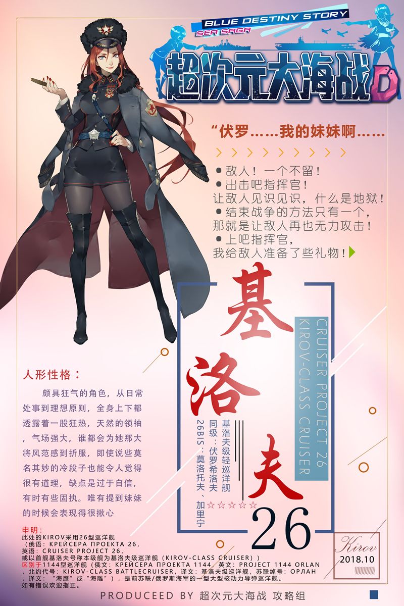 “结束战争的方法只有一个,那就是让敌人再也无力攻击!” 颇具狂气的角色,从日常处事到理想原则,全身上下都透露着一股狂热。 天然的领袖,气场强大,谁都会为她那大将风范感到折服,即使说些莫名其妙的冷段子也能令人觉得很有道理。 缺点是过于自信,有时有些固执。唯有提到妹妹的时候会表现得很揪心。 基洛夫技能展示: