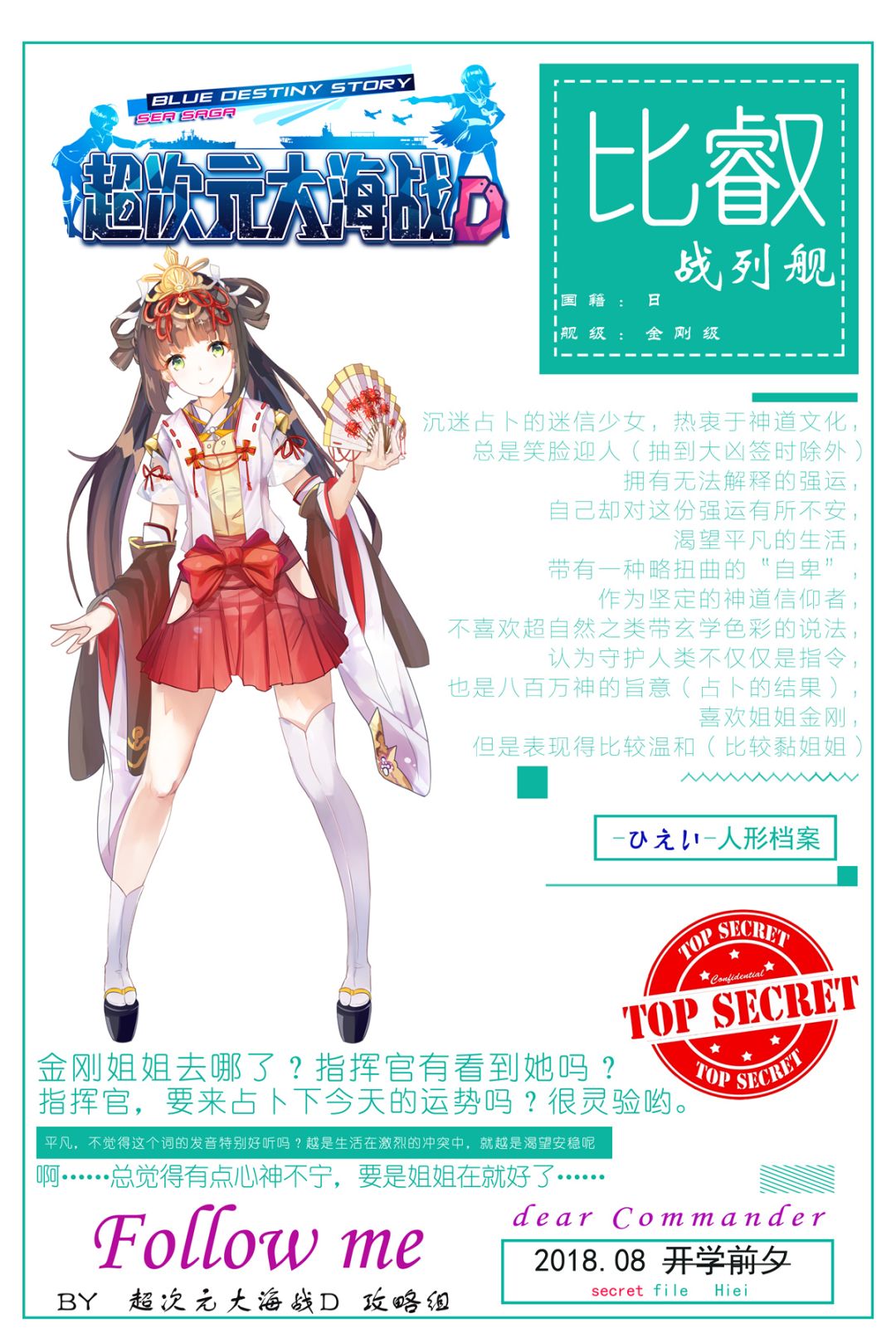 “指挥官,今天的战果怎么样?即使暂时不太顺利也请不要担心,比叡已经占卜过啦,我们一定会夺得最后的胜利!请一定坚持下去!” 沉迷占卜的迷信少女,热衷于神道文化,总是笑脸迎人(抽到大凶签时除外)。 拥有无法解释的强运,自己却对这份强运有所不安,渴望平凡的生活。 比叡技能展示: 今日比叡登场!ヾ(*´▽‘*)ノ 前段时间参加的广州漫展,我们的展位上有cos成比叡的小姐姐呢~ 去过麽多漫展的指挥官有没有看