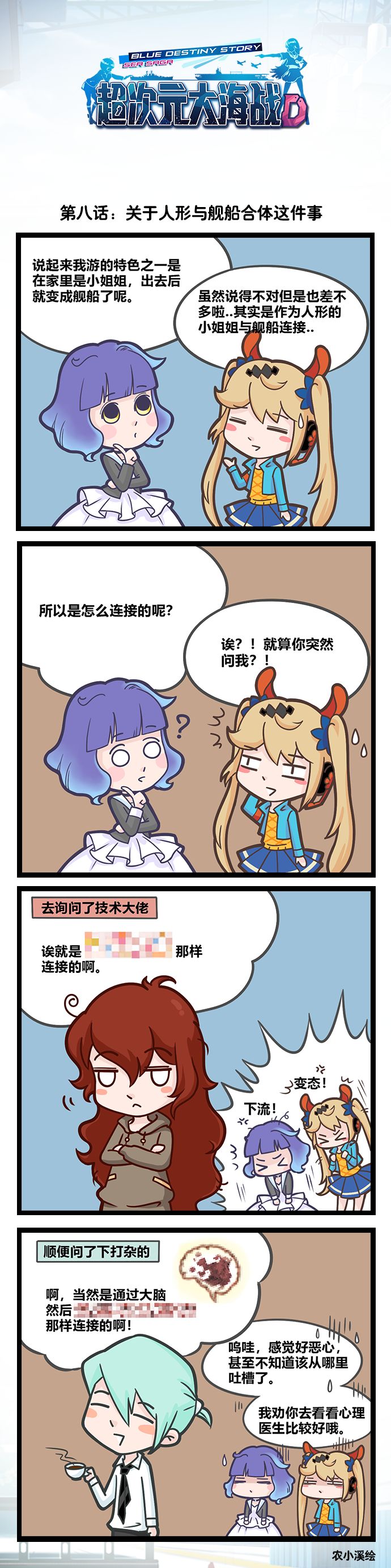我游的人形与舰船是怎么连接在一起的呢?还请收看今日的走近科学!(误) 第八话:关于人形与舰船合体这件事~ 本期老朋友介绍: 玛希:长期出没在官方Q群里人♂见♂人♂爱的客服小哥哥 爱莉:掌管《超次元大海战》官方微博的微博娘(著名灵魂画师!~) 打杂的:打杂小哥,神出鬼没,似乎什么都在做又什么都没有做的神秘角色 技术大佬:真·游戏大佬,敲代码的实力也超强,是个懒得打扮的隐性大美女! 四格漫画之后会持续