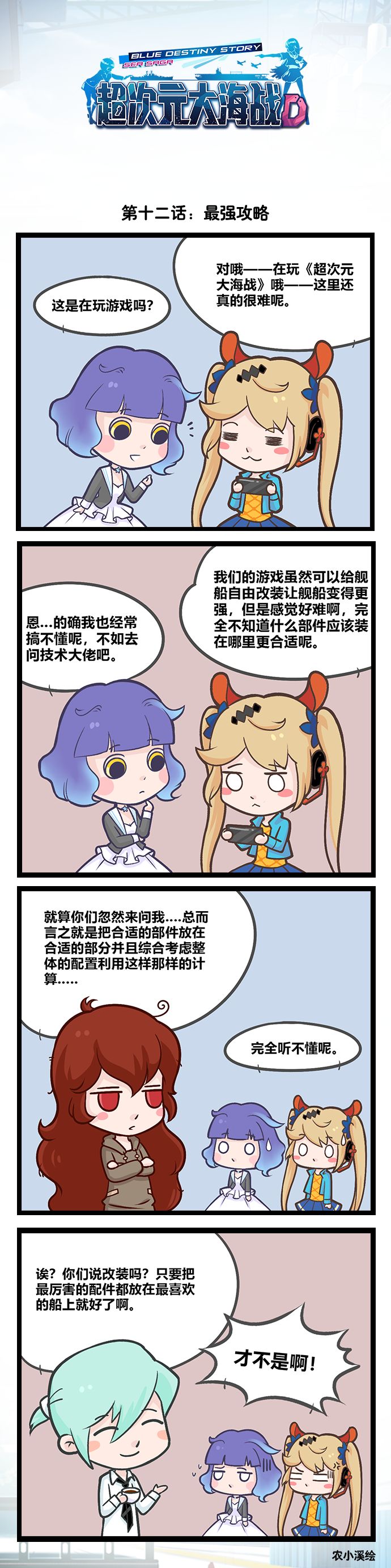 在《超次元大海战》中,舰船的装备是可以自己动手改装的(被亲切地称呼为「魔改」≖‿≖✧ ) 那么怎样改装才能让自己的舰(老)船(婆)变得更强呢? 来看看爱莉和玛希对此的研究吧~(๑•̀ㅂ•́)و✧ 今日更新四格漫画第12话:最强攻略! 本期人物介绍: 玛希:长期出没在官方Q群里人♂见♂人♂爱的客服小哥哥 爱莉:掌管《超次元大海战》官方微博的微博娘(著名灵魂画师!~) 打杂的:打杂小哥,神出鬼没,似乎