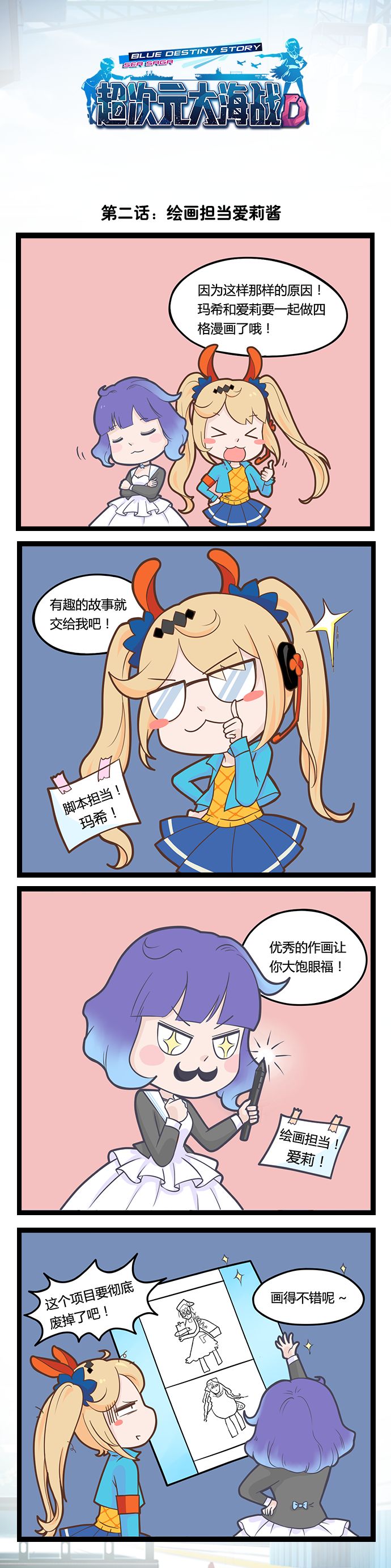 《超次元大海战》原创四格漫画第二话开始啦!~ 今天依然是办公室里的故事哦~ 次元娘先来为大家介绍一下本期的两位登场人物!(๑•̀ㅂ•́)و✧ 玛希:长期出没在官方Q群里的客服小哥♂哥 爱莉:掌管《超次元大海战》官方微博的微博娘(著名灵魂画师!~) 下面来看看玛希和爱莉(争风吃醋)的日常吧~๑乛◡乛๑