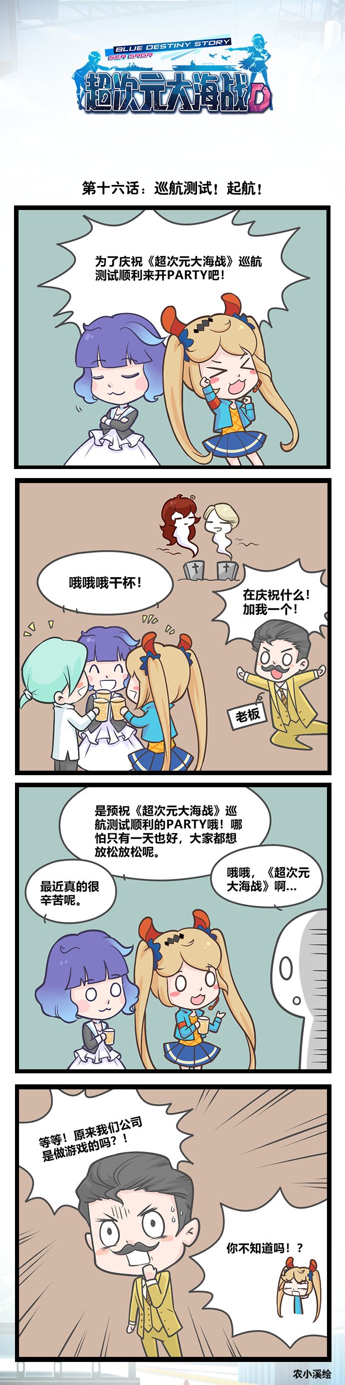 《超次元大海战》顺利开始巡航测试啦!为了准备迎接这一天的到来真的做了非常多的努力呢~ 玛希和爱莉决定先小小庆祝一下~ 这时候...老板出现了! 在四格漫画中首次登场的老板,会给我们带来怎样的惊♂喜呢? 今天更新的是第16话:巡航测试!起航! 本期人物介绍: 玛希:长期出没在官方Q群里人♂见♂人♂爱的客服小哥哥 爱莉:掌管《超次元大海战》官方微博的微博娘(著名灵魂画师!~) 老板:看上去一本正经的严