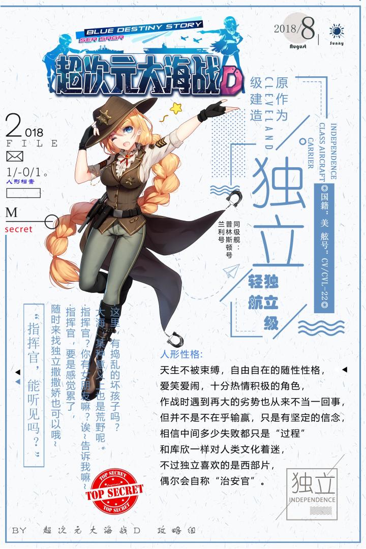 “指挥官?你有女朋友嘛?诶~告诉我嘛~”天生不被束缚,自由自在的随性性格。爱笑爱闹,十分热情积极。作战时遇到再大的劣势也从来不当一回事,但并不是不在乎输赢,只是有坚定的信念,相信中间多少失败都只是“过程”。和库欣一样对人类文化着迷,不过独立喜欢的是西部片,偶尔会自称“治安官”。