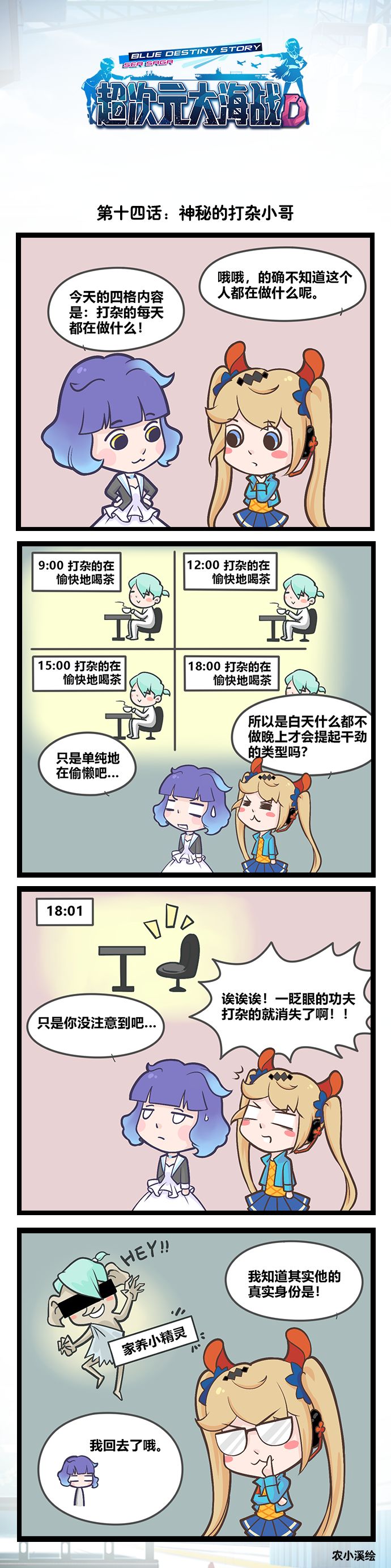 仔细想一想,打杂小哥的出场率真的很高呢!平时他都在做什么呢?玛希和爱莉决定偷偷地进行观察......今天更新的是第14话:神秘的打杂小哥本期人物介绍:玛希:长期出没在官方Q群里人♂见♂人♂爱的客服小哥哥爱莉:掌管《超次元大海战》官方微博的微博娘(著名灵魂画师!~)打杂的:打杂小哥,神出鬼没,似乎什么都在做又什么都没有做的神秘角色