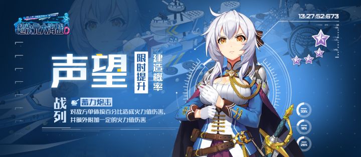 四星战列「声望」建造概率限时提升活动开启!建造时间:1月22日至1月26日建造公式:物资350,燃油450,钢材350。建造概率:4%舰船简介:主动技能“蓄力炮击”可以对敌方单体按百分比造成火力值伤害,并额外附加一定的火力值伤害。此次参与建造概率提升活动的人形,将在1月27日开启的竞技场周期中加入积分加成阵容。五星轻巡「基洛夫」建造概率限时提升活动开启!建造时间:1月23日至1月27