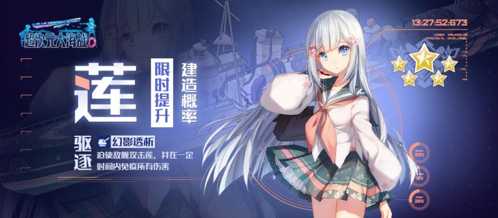 五星驱逐「莲」建造概率限时提升活动开启!建造时间:1月10日至1月14日建造公式:物资450,燃油50,钢材850。建造概率:2%舰船简介:主动技能“幻影透析”可以迫使敌舰攻击莲,并在一定时间内免疫所有伤害。此次参与建造概率提升活动的人形,将在1月13日开启的竞技场周期中加入积分加成阵容。五星配件生产概率限时提升活动开启!活动时间:1月10日至1月14日【H型集束鱼雷舱】生产公式