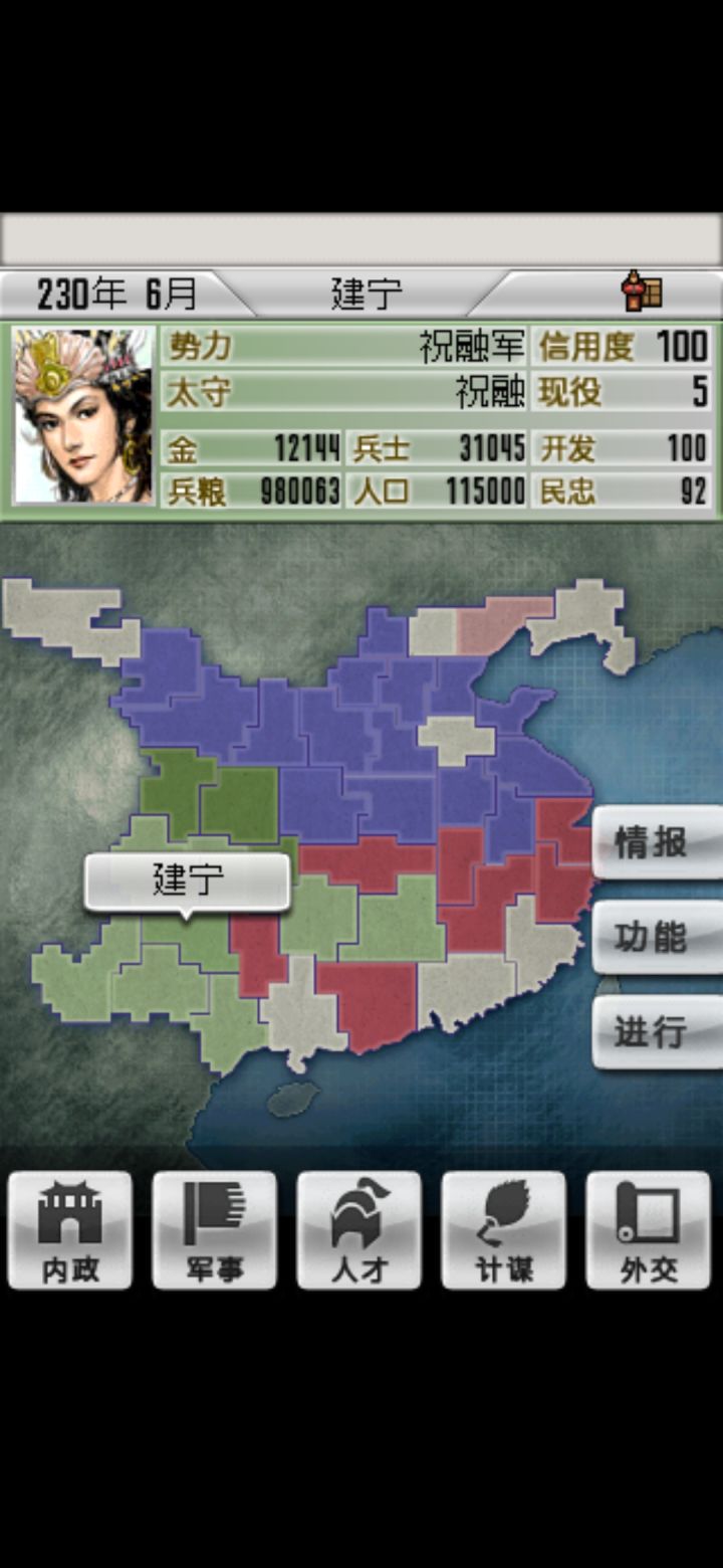 玩三国鼎立专家版。选了一个难度很高的孟获。开局就让他去自杀,让祝荣当君主。策略选错了。应该去打孙权的。应该主要进攻孙权那边那边,导致打了这么多年才四足鼎立。没有登陆武将。打着真的难受。哈哈哈。慢慢来。困难的时期已经过去了。