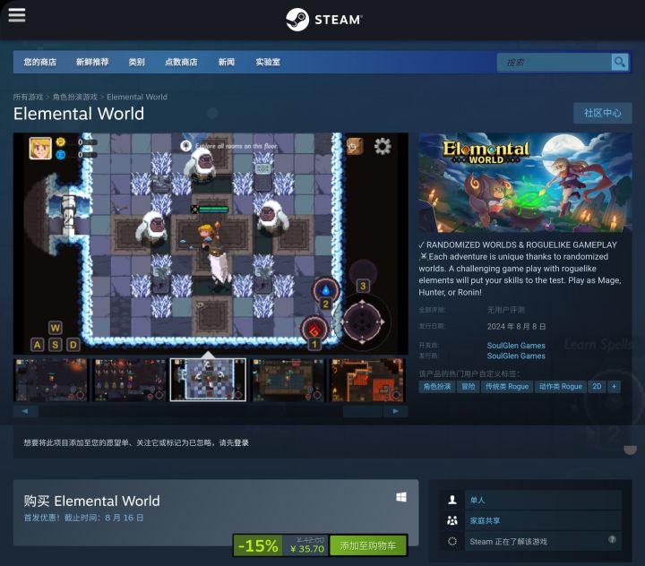 原手游“元素地牢”8月8号正式上线Steam平台!目前设定为买断制,暂无任何内购,现定原价42元,首发限时售价35.70元。暂不支持多人联机,后续会继续跟进。购买方式:打开Steam商店搜索Elemental World或点击链接https://store.steampowered.com/app/2469490/Elemental_World/?beta=1直达商店页面购买。PS:本文为玩家