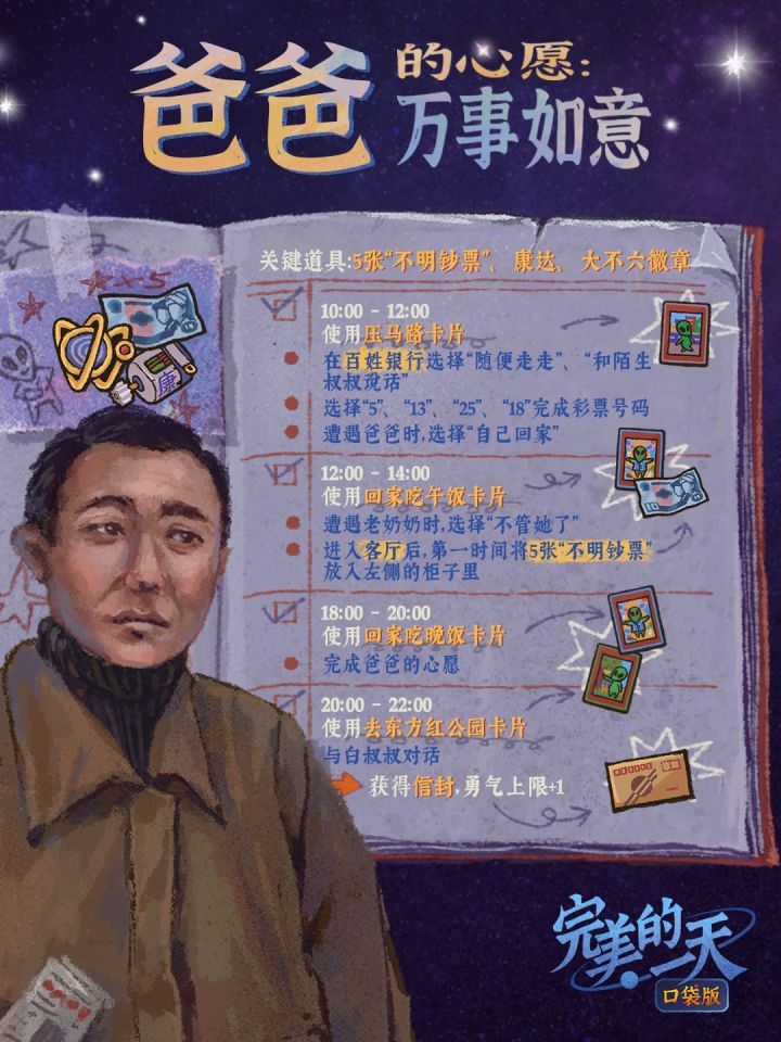 以下流程攻略涉及了大量游戏内容剧透,在此建议有需要的各位大不六星人选择性查看——注意:此攻略仅为官方推荐路线,部分道具的获取方式并不唯一,欢迎大家在评论区中讨论补充~如果你在游玩过程中遇到了问题,欢迎前往玩家手游群,会有其他玩家和管理员前来帮助你度过更加《完美的一天》!——————————《完美的一天》手游交流群:757216647