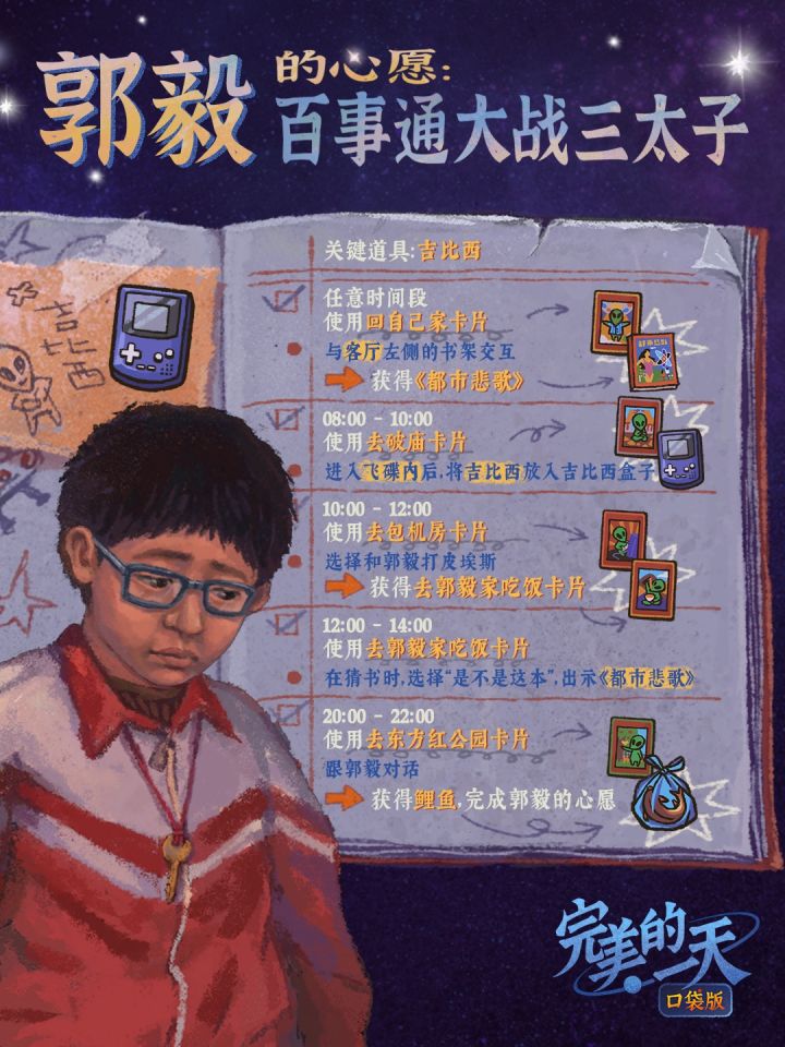以下流程攻略涉及了大量游戏内容剧透,在此建议有需要的各位大不六星人选择性查看——注意:此攻略仅为官方推荐路线,部分道具的获取方式并不唯一,欢迎大家在评论区中讨论补充~如果你在游玩过程中遇到了问题,欢迎前往玩家手游群,会有其他玩家和管理员前来帮助你度过更加《完美的一天》!——————————《完美的一天》手游交流群:757216647