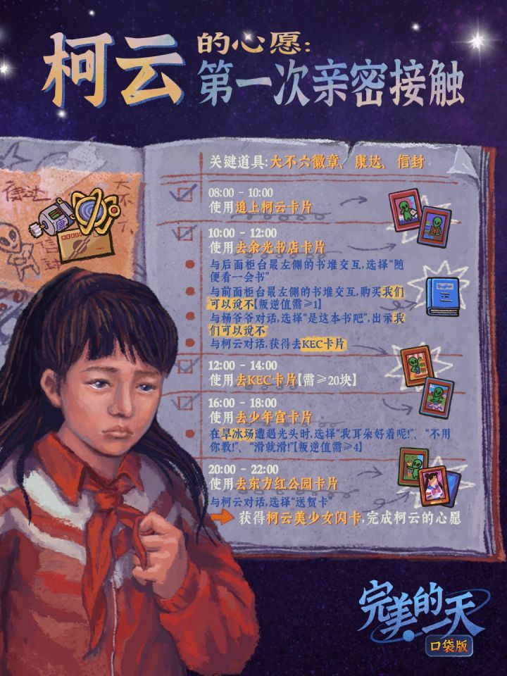 本攻略是由一名电脑版老玩家制作的攻略,本攻略并不会将每一步具体怎么做写的太过于详细,而仅仅只是一个流程攻略。这也是为了看攻略还想体验剧情的人能有体验感。即使如此,看攻略依然会造成剧透。以下是攻略。(不想被剧透,哪怕一点儿都不想的,以下就等通关后即红烧肉线打完再来看吧)相信很多玩家已经发现,完美一天是相对而言的,只能帮助一个人或一个家庭达成完美的一天,而主角自己的完美一天就是柯云线。那么按照执