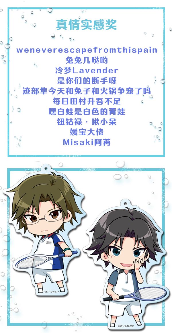 亲爱的米娜桑o(^▽^)o~在《新网球王子 RisingBeat》国服主题日结束后我们收获了超100份的repo反馈和夸奖,每一份都让我们感受到了无比的动力和喜悦!!!我们在出其中20选出了位玩家,赶快来看看有那些小伙伴获奖了吧!以上获奖玩家将分别获得OVA限定亚克力钥匙圈和限定徽章奖励,其余未获奖的玩家也不要气馁,主题日REPO征集活动还在B站继续,快把你关于主题日的回忆编辑图文上传B站