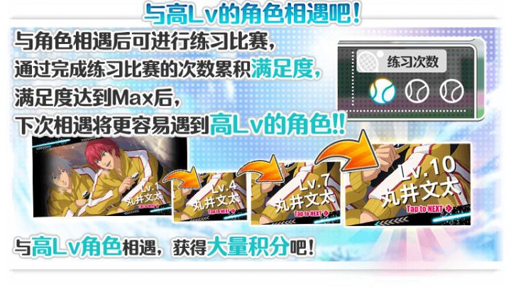 活动时间:4月11日 维护后~4月16日 22:59》限时开放!并额外开放三首活动曲《每天都是Happy New Year》、《网球王子真好》、《W-rainbow》,消耗活动道具「相遇碎片」/奖牌 挑战活动曲目完成挑战后可100%开启限时“相遇任务”,完成“相遇任务”即可获得大量PT点数。