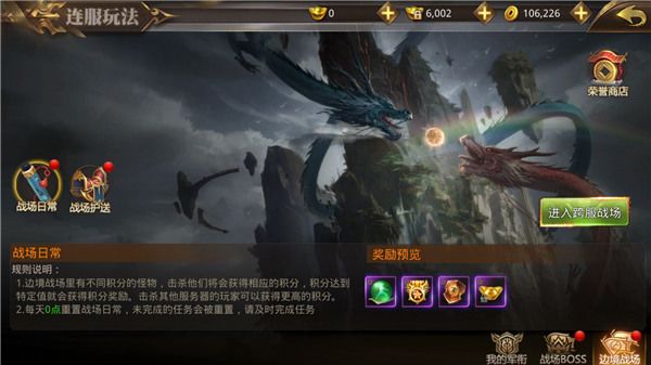 《绝世武林》里拥有独特的连服玩法,不需要通过合服等复杂操作即可与其他服的玩家一较高下,今天就来给大家介绍一下连服玩法的具体特点吧~在主界面的右上方点击连服按钮就可以进入连服玩法,里面又分为战场日常和战场护送。其中战场日常里会有不同积分的怪物,击杀他们会获得相应的积分,而且战场里还有来自其他服务器的玩家,击败他们后会获得更高的积分。此外战场里还有各种boss的存在,击杀后不仅能获得积分,更有大量