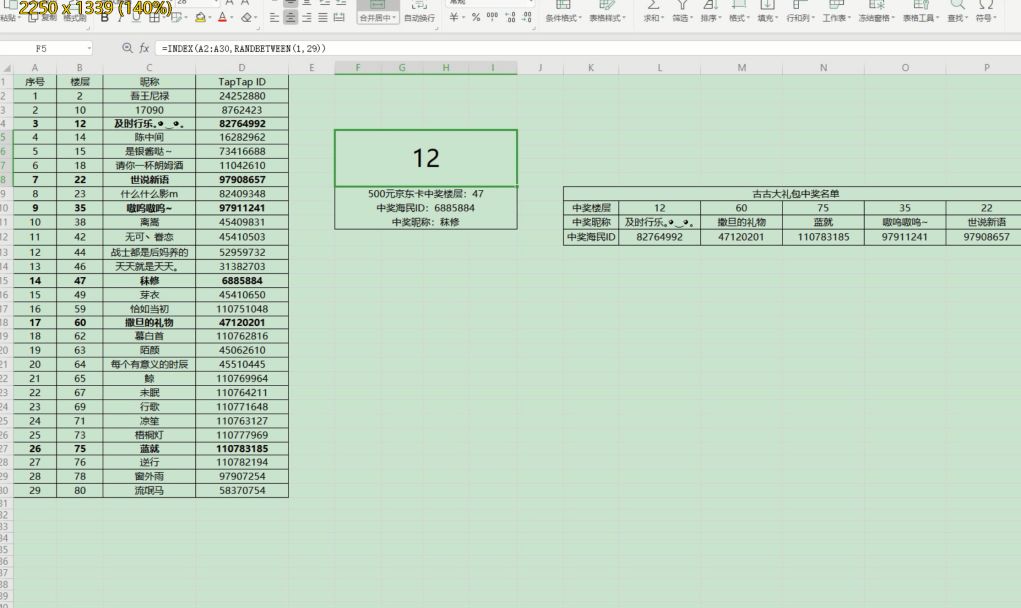 喔喔!又到了激动人心的开奖时间!!(大表哥忍不住搓手手)大表哥在有效回复中,通过Excel随机数选取了:1名海民,送出#大表哥为你买单#的500元京东卡5名海民,送出#古古用爱发电#的古古周边大礼包事不宜迟,快跟大表哥我一起看看↓恭喜以上6位海民!由于TapTap社区没有私信功能,请中奖的海民联系 QQ:1409653557提供获奖证明以及相关信息(超过7天未联系的海民就视为放弃资格哦