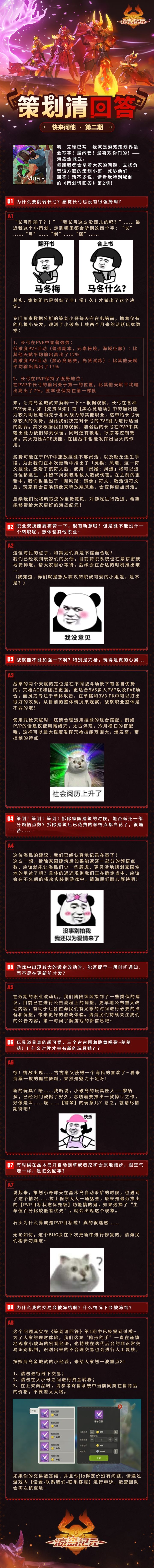 嗨,我的宝贝海民们!你们最帅气的大表哥又在线营业了。今天大表哥邀请来了你们最想喷的策划(代表)——海岛金城武!他带着近期大家最常讨论的8个问题,更新内容小秘密来啦!既然你看到了这里,那必须给你预告点明日狠货!线索1:归去来兮,业火涅槃。全新神选宠物「大炎金乌」明日登陆!线索2:部落3V3 PVP全新玩法震撼来袭线索3:「结晶洞窟」副本开启传奇难度还有什么问题或建议,来喷!大表哥杰