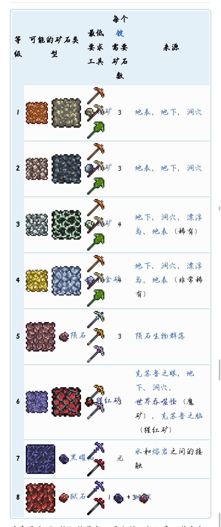 一直在犹豫要不要做个矿石的专题,挖矿这个事业贯穿一个游戏的几乎全部流程,而矿石的门道也许不止那么简单,OK,let's begin....在原版泰拉一共有21种矿(包含黑曜石,月明矿)23种锭和7种宝石: (Wiki)PS:宝石的开采通常是嵌在石头缝里,就像这样:或者在宝石洞里挂壁(*σ´∀`)σ矿石的分布和世界的类型有着紧密的联系,就好像血腥世界就只有血腥矿,而没有魔能矿。下面是矿石对